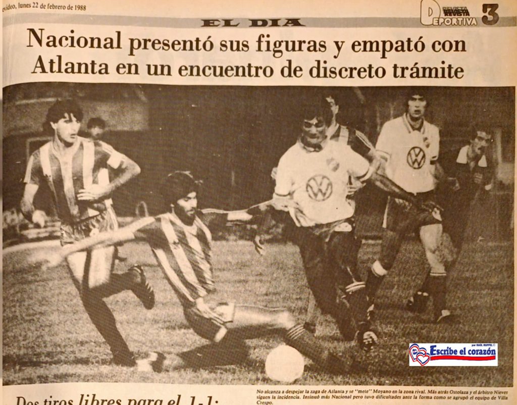 El partido presentación ante Atlanta de Argentina fue el domingo 21 de febrero, cotejo que dejó muchas dudas, para la mayoría de la prensa especializada el doloreño Santiago Ostolaza era demasiado lento y Nacional tenía que buscar allí más dinámica si quería apostar a algo importante…además de irse expulsado a los 62’. Ese mismo Ostolaza diez meses después terminó llevándose el Toyota que se le adjudicaba al mejor jugador de la final de la Intercontinental.