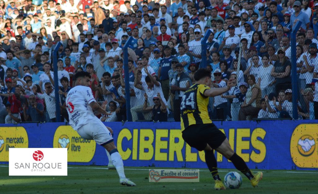 Diego Polenta empujando al equipo, lo marca Sebastián Rodríguez, el más silbado de la tarde.