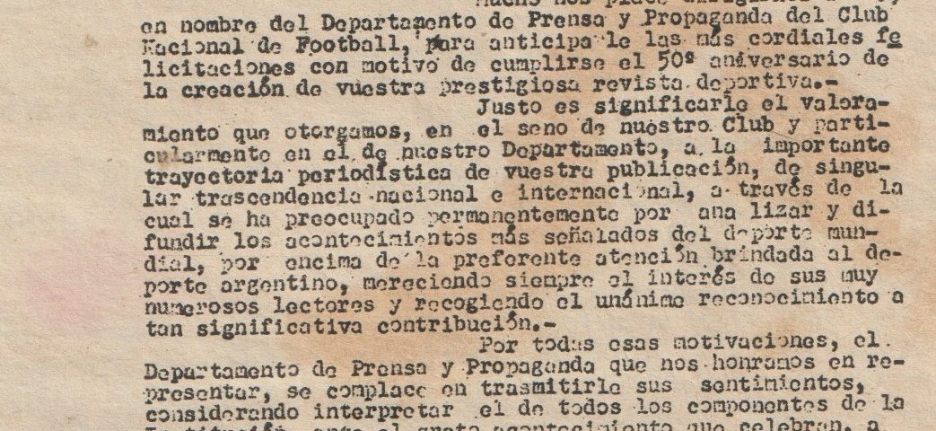 Revista deportiva argentina EL GRÁFICO. Marcó generaciones, fundada el 30/05/1919 por el uruguayo Constancio Vigil. Compartimos el saludo del Club Nacional de Football en 1969 tras los primeros 50 años de El Gráfico. Hoy 22/05/2025 , 106 años pasaron de la primera publicación..